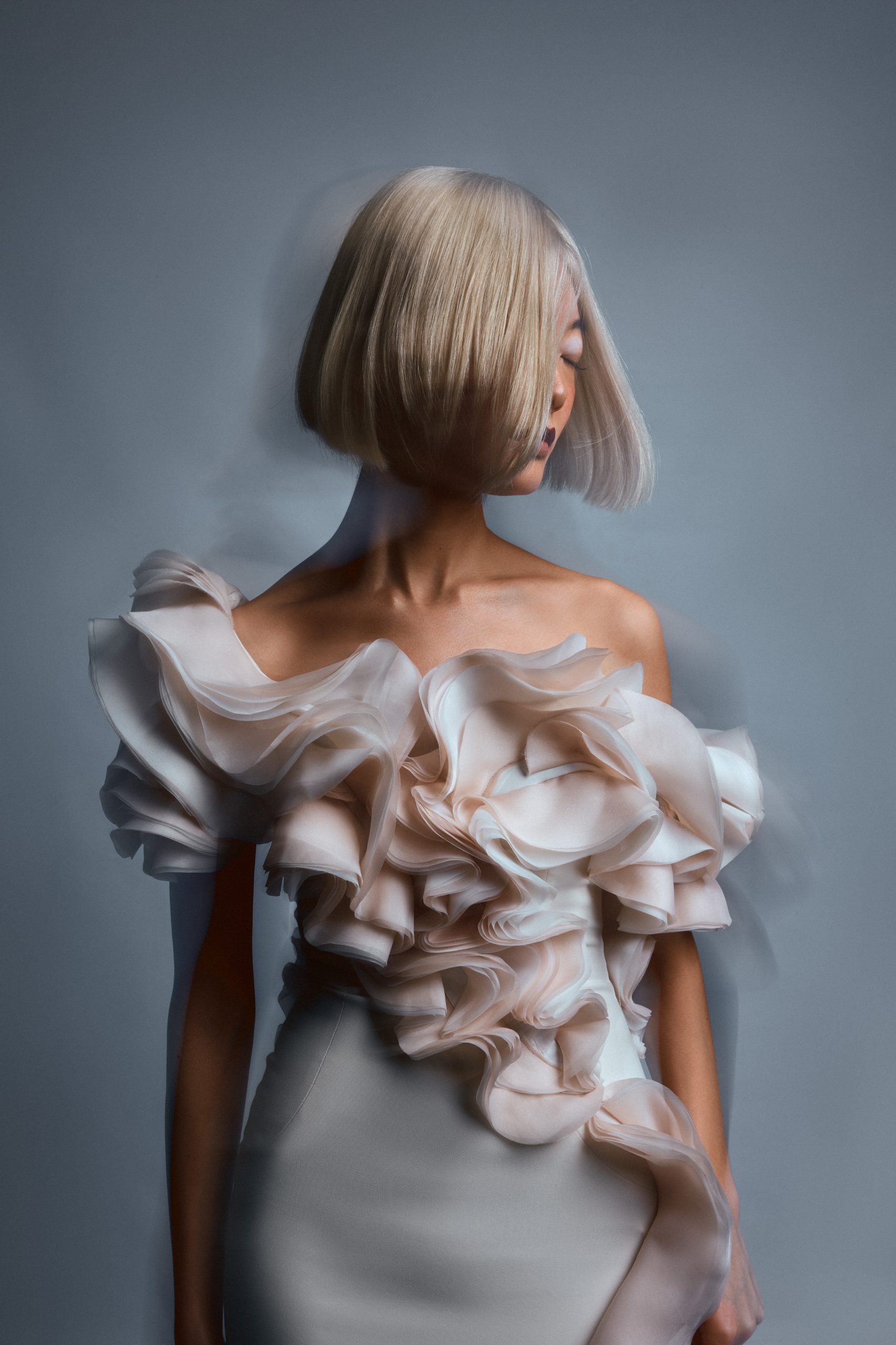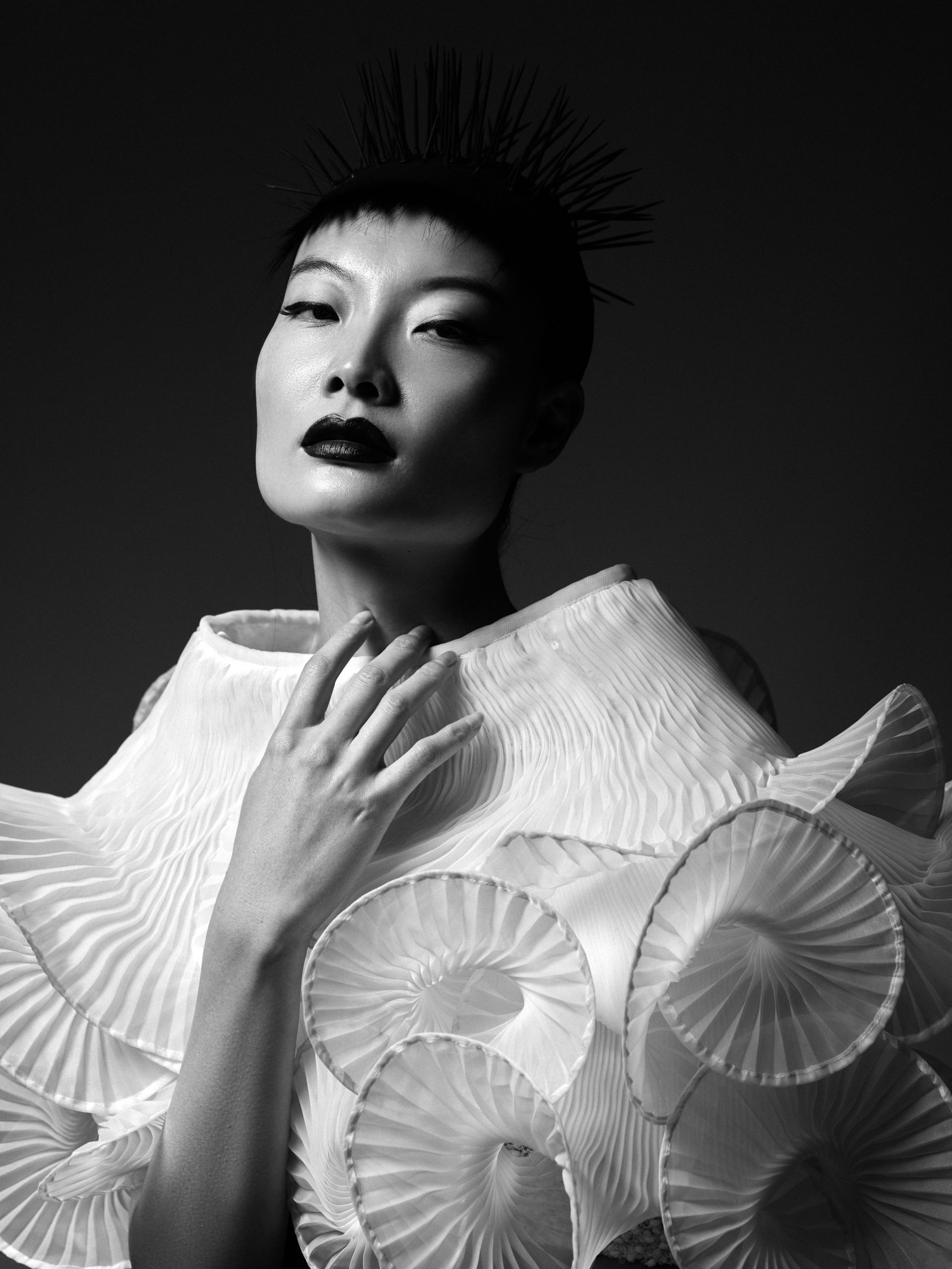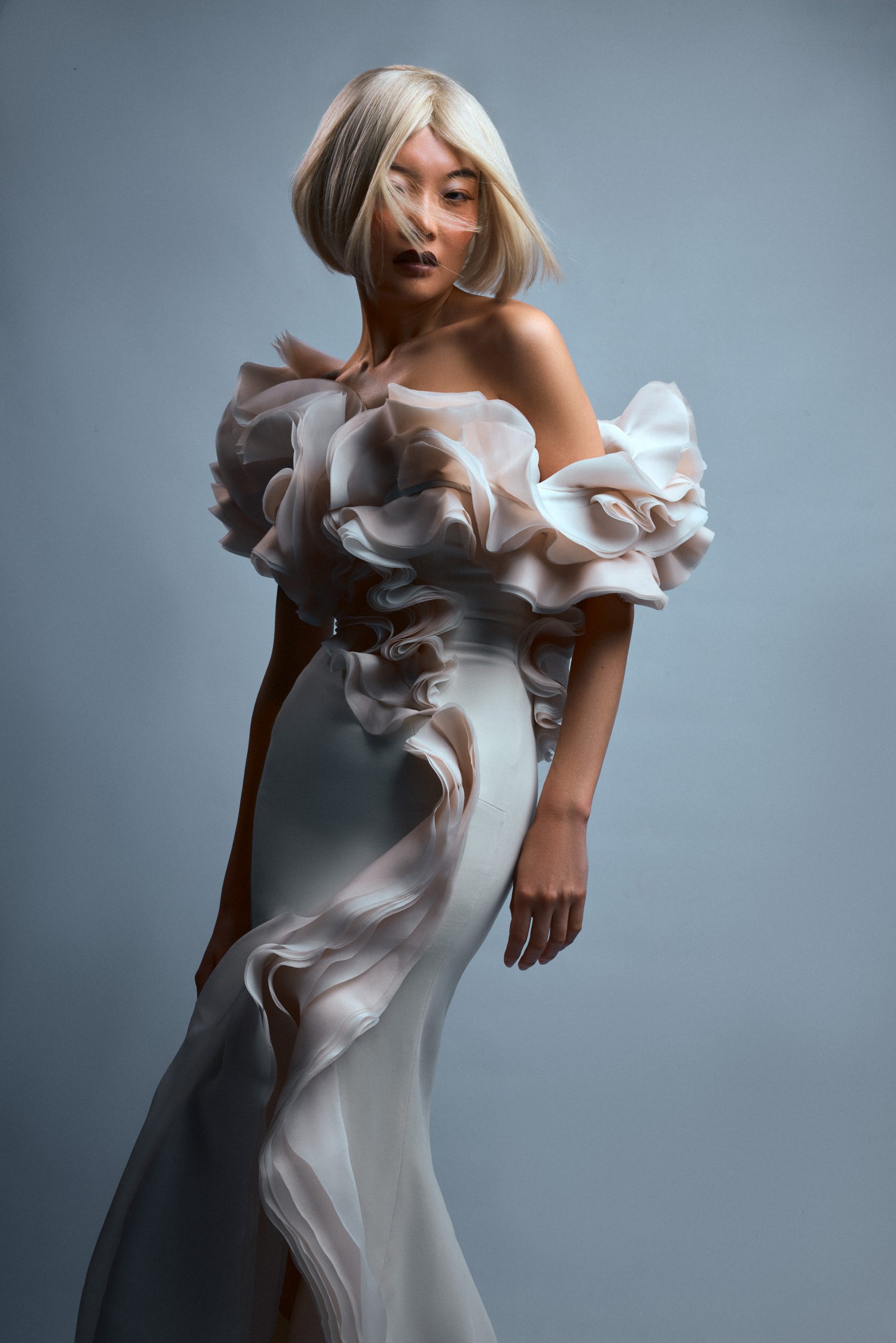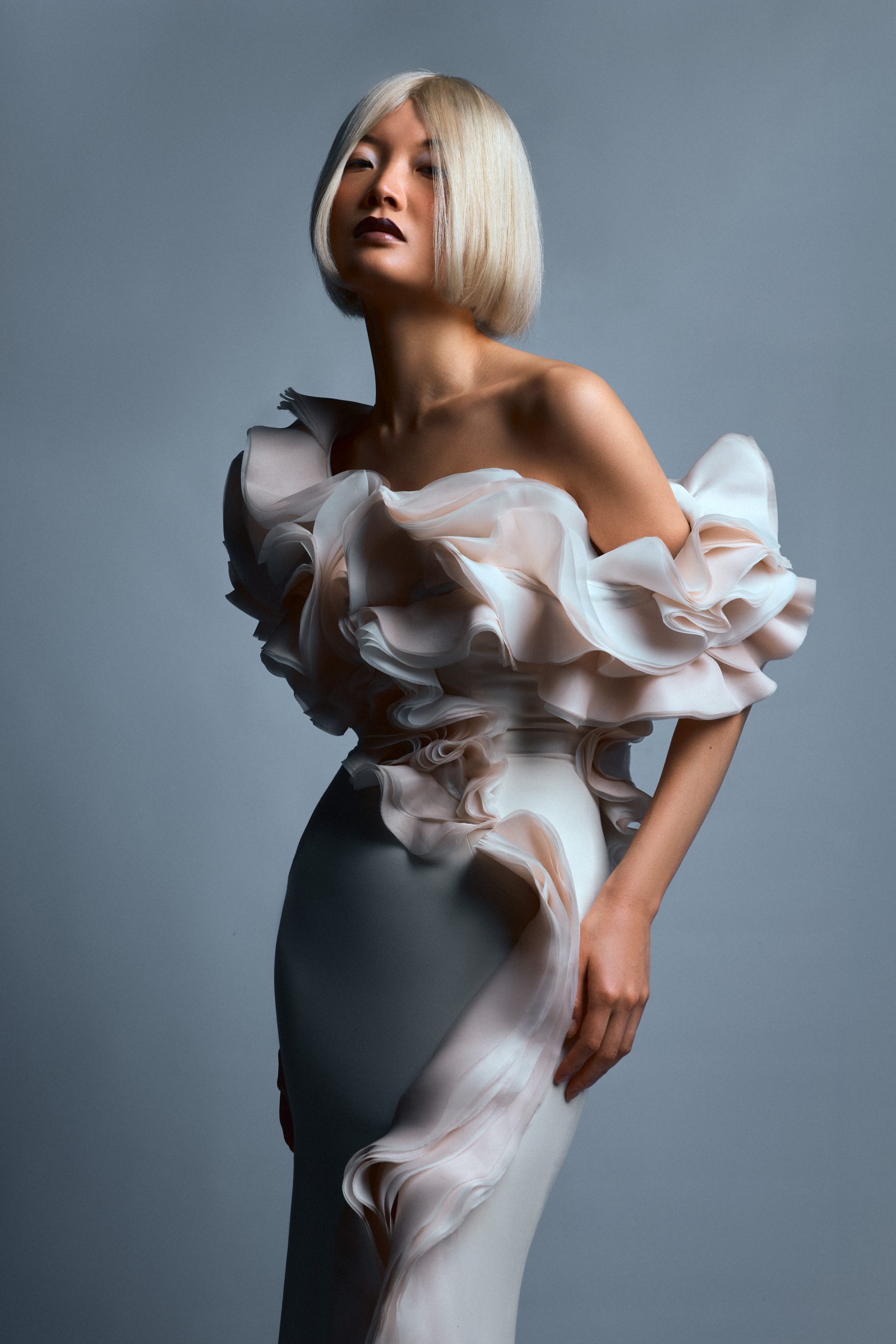 La silhouette de Chihiro s’affirme ici comme une surface d’expression brute, où la matière dicte une prise de position esthétique sous l’objectif de Kenny V. Le stylisme de Sielle, assistée de Work X Design, sculpte le corps à travers des pièces architecturales de Gaby Charbachy et Juozas Couture Paris, faisant dialoguer des blancs structurels et des dentelles délicates avec des volumes beige rosé ou marron enveloppants. Sublimées par les bijoux Mam, ces créations oscillent entre douceur sculpturale et présence théâtrale, portées par le maquillage graphique de Tama Reese et les coiffures dramatiques de Jérôme Fendt. Les contrastes chromatiques profonds et les jeux de lumière construisent une narration visuelle cinématographique où la haute couture et l’attitude se rencontrent dans un équilibre précis entre force et subtilité.