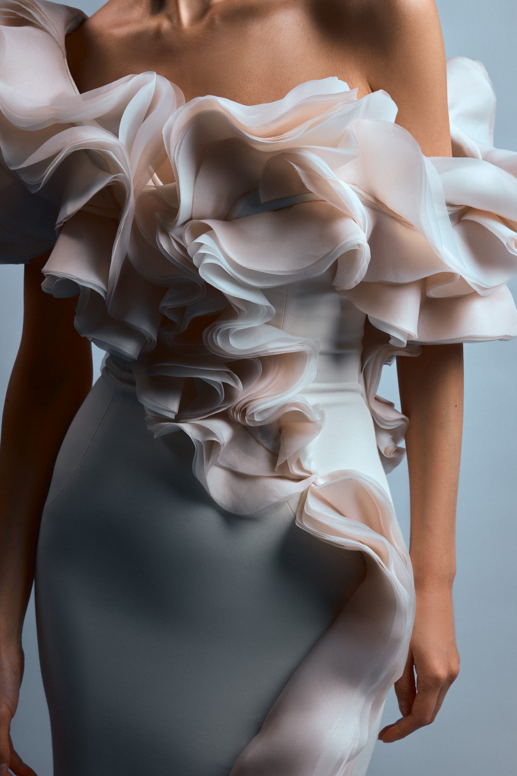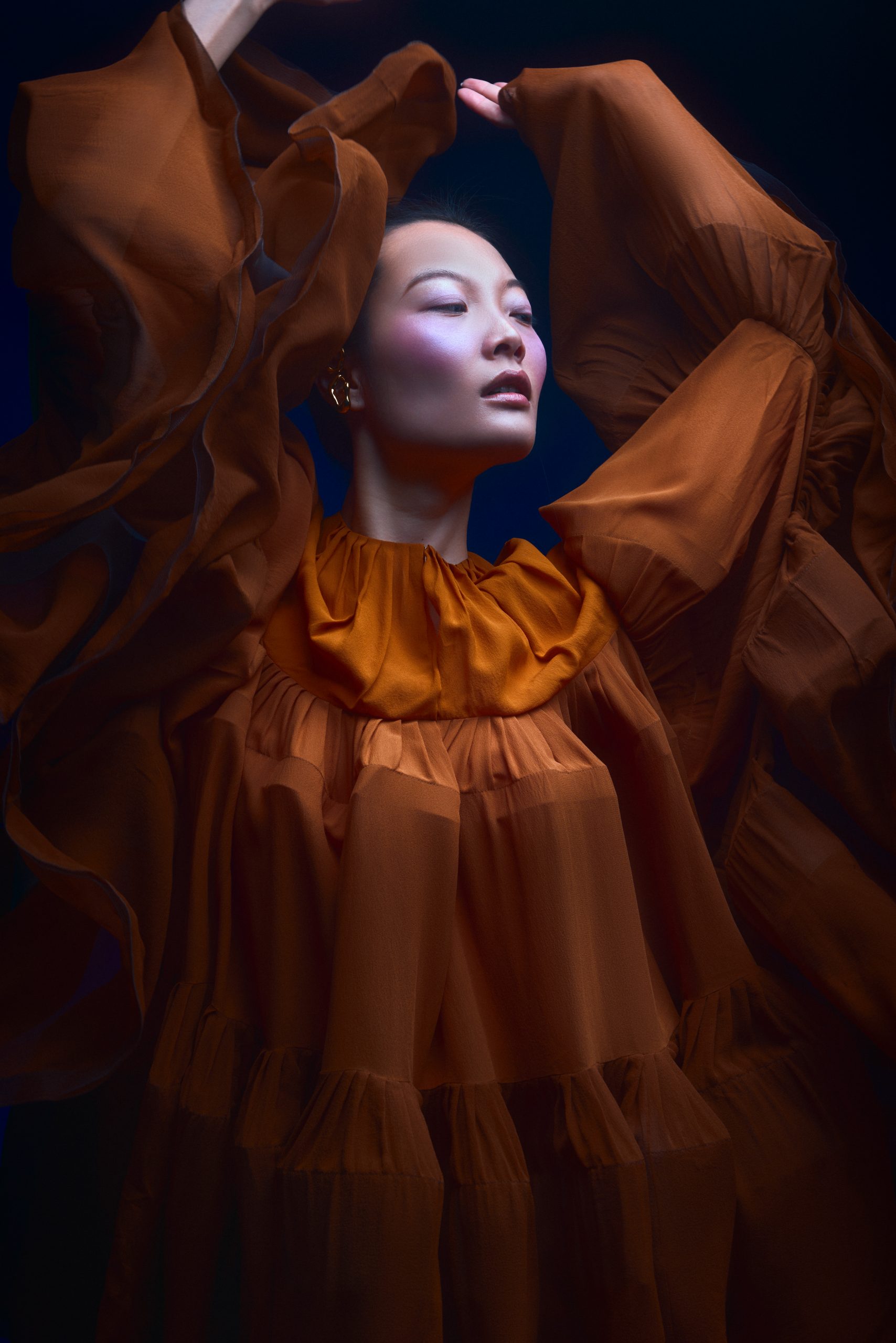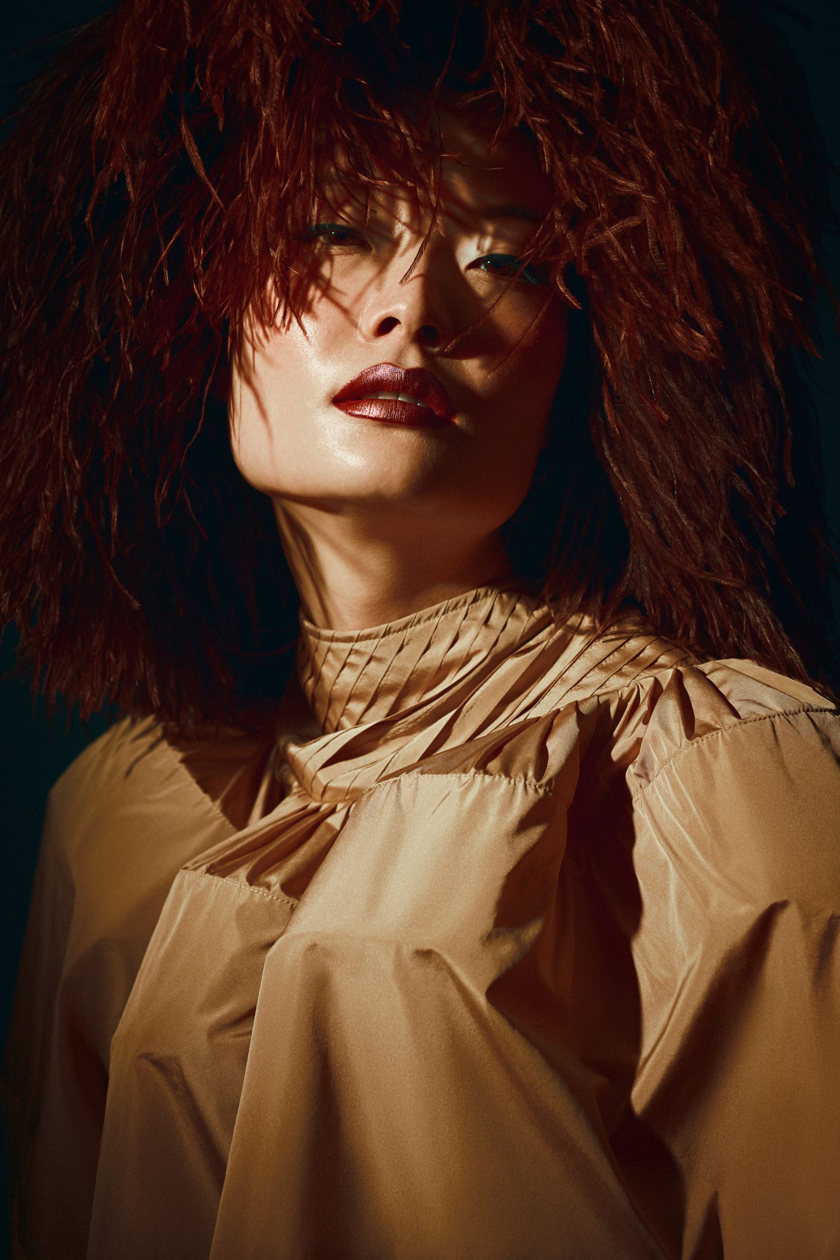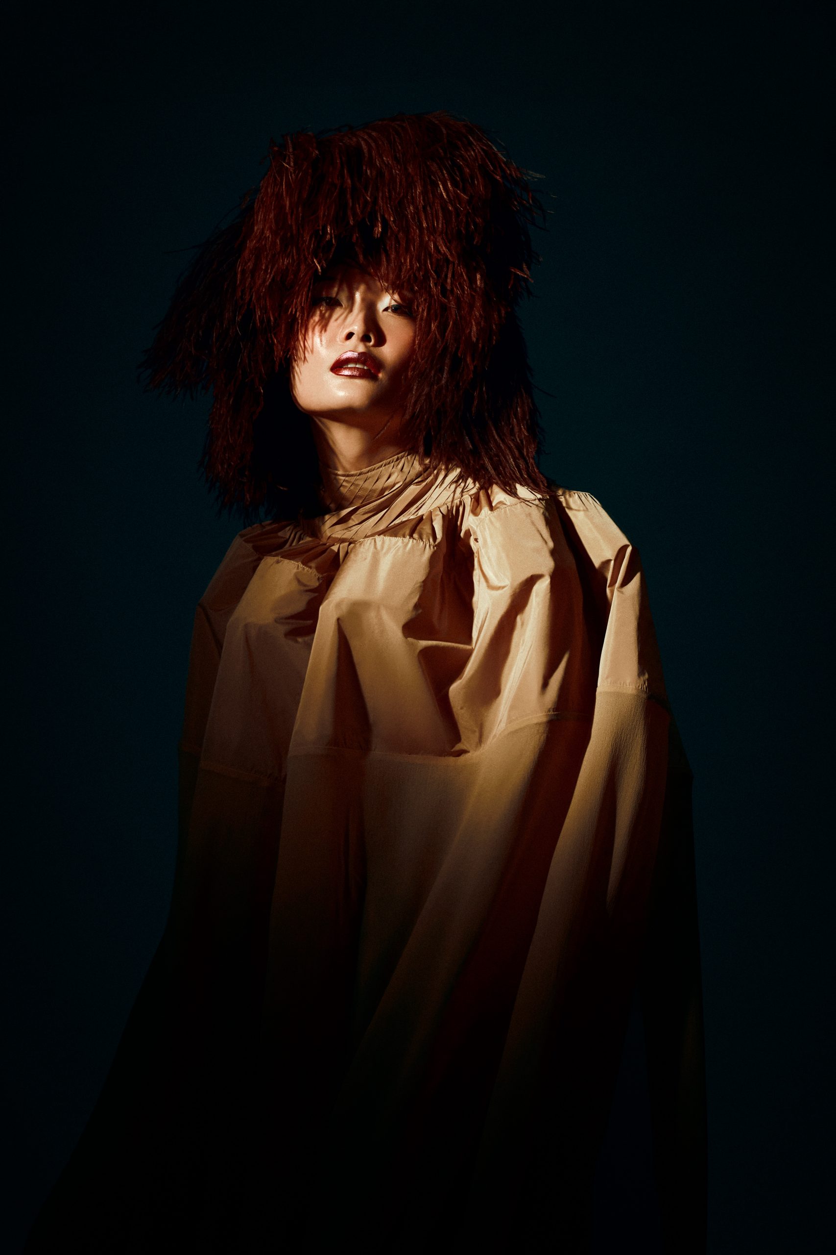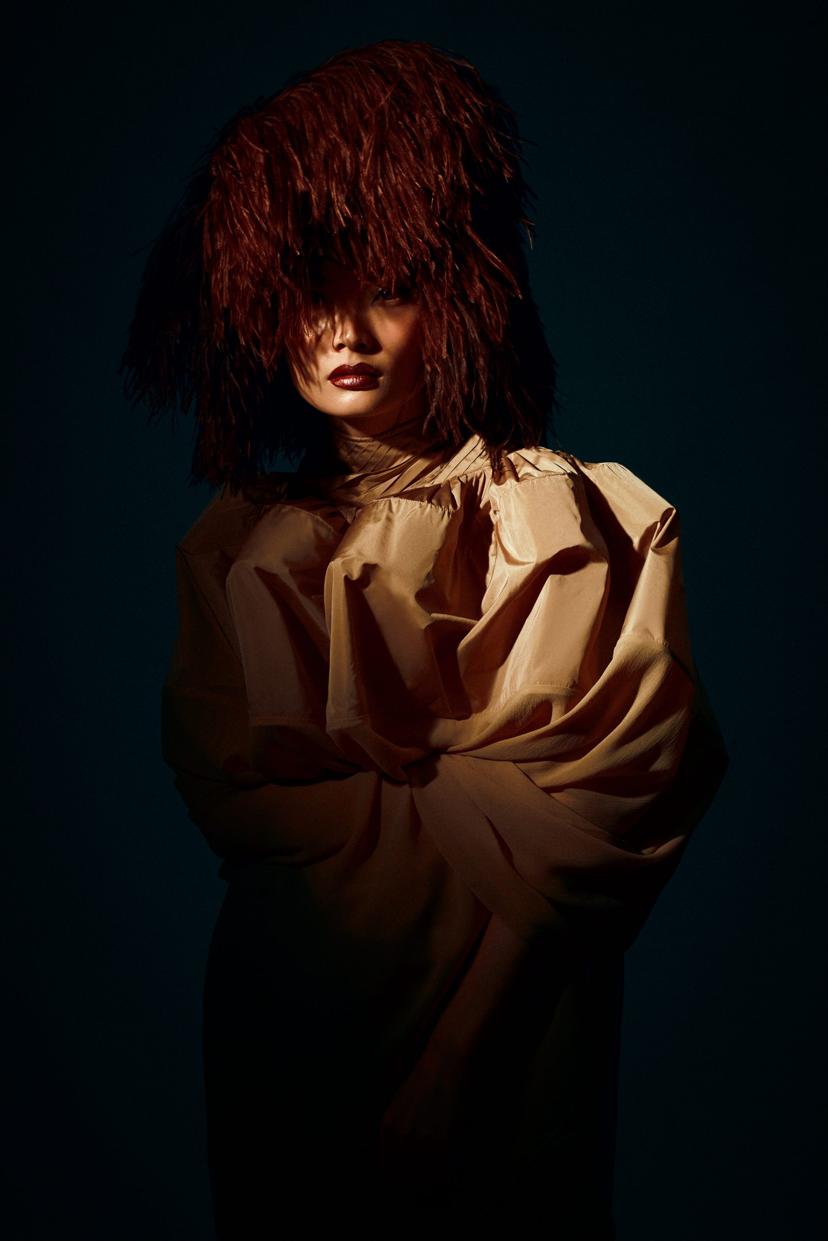 La silhouette de Chihiro s’affirme ici comme une surface d’expression brute, où la matière dicte une prise de position esthétique sous l’objectif de Kenny V. Le stylisme de Sielle, assistée de Work X Design, sculpte le corps à travers des pièces architecturales de Gaby Charbachy et Juozas Couture Paris, faisant dialoguer des blancs structurels et des dentelles délicates avec des volumes beige rosé ou marron enveloppants. Sublimées par les bijoux Mam, ces créations oscillent entre douceur sculpturale et présence théâtrale, portées par le maquillage graphique de Tama Reese et les coiffures dramatiques de Jérôme Fendt. Les contrastes chromatiques profonds et les jeux de lumière construisent une narration visuelle cinématographique où la haute couture et l’attitude se rencontrent dans un équilibre précis entre force et subtilité.